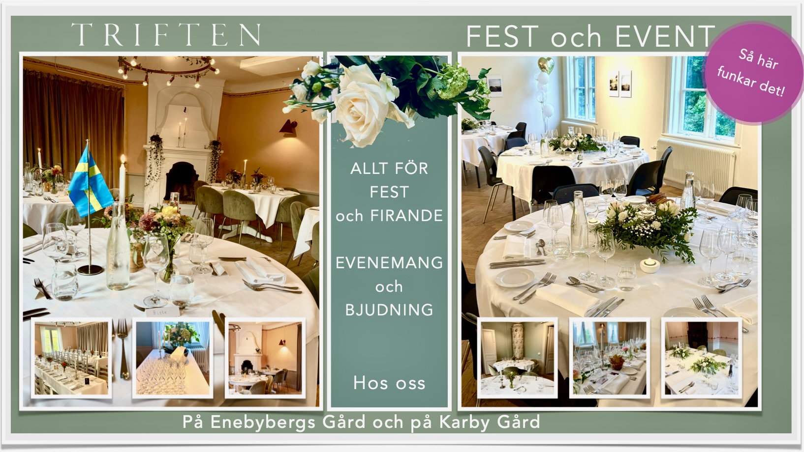 Att mötas för att fira och umgås med god mat och dryck är något av det vi tycker allra bäst om. Under årets traditionella högtider – Påsk, Midsommar och Jul erbjuder Triften alltid fina och traditionella middagar att avnjuta hos oss på Enebybergs Gård eller Där du är.